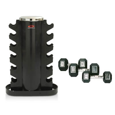 Inkluderar 6 par (12 st) hexhantlar av gummi med behagliga grepp och ett kraftigt hantelställ.