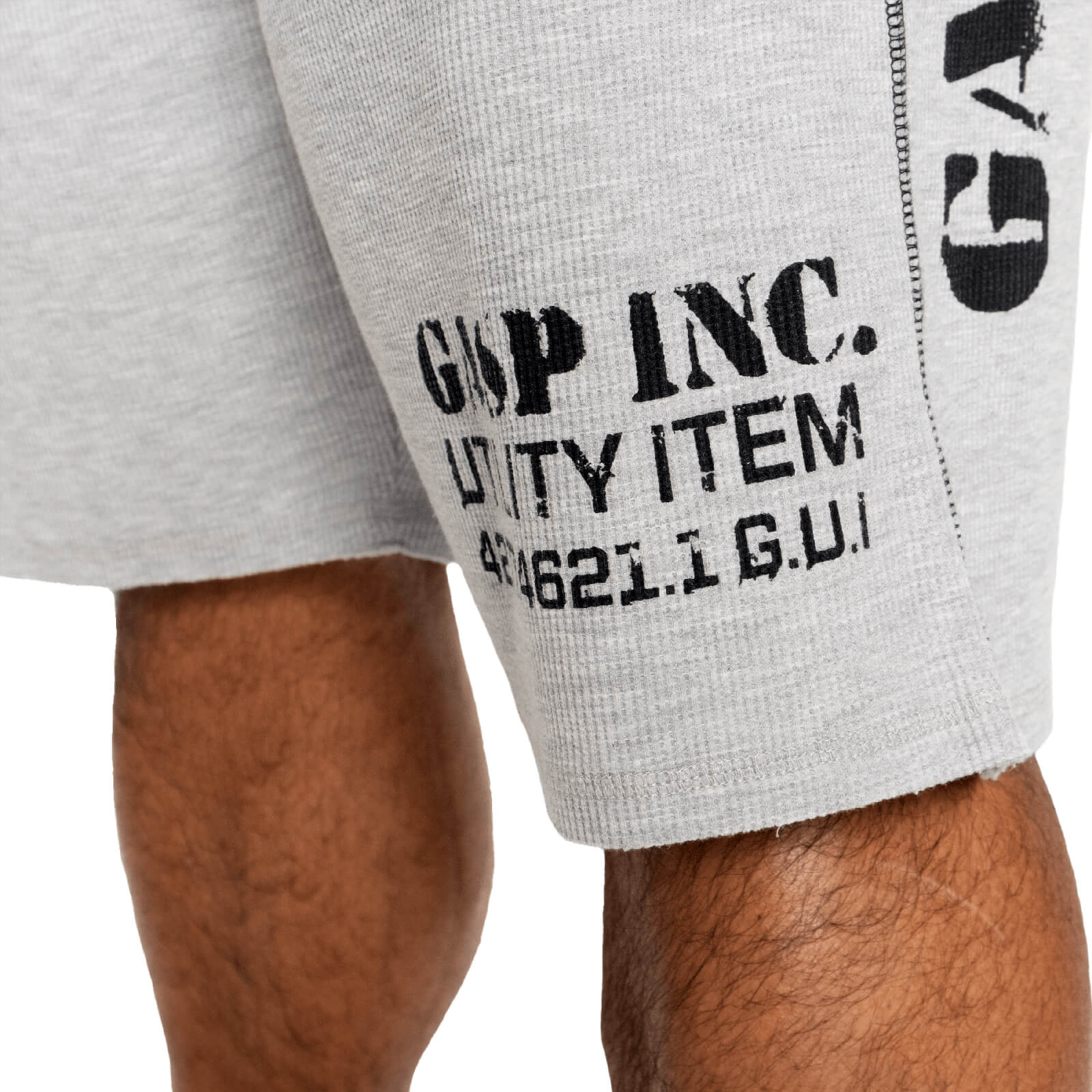 Gråa shorts från GASP med en dragsko av kraftig bomull vid midjan och två välplacerade GASP-tryck på vänstra benet, en i fram och en som går vertikalt nedför i bak.