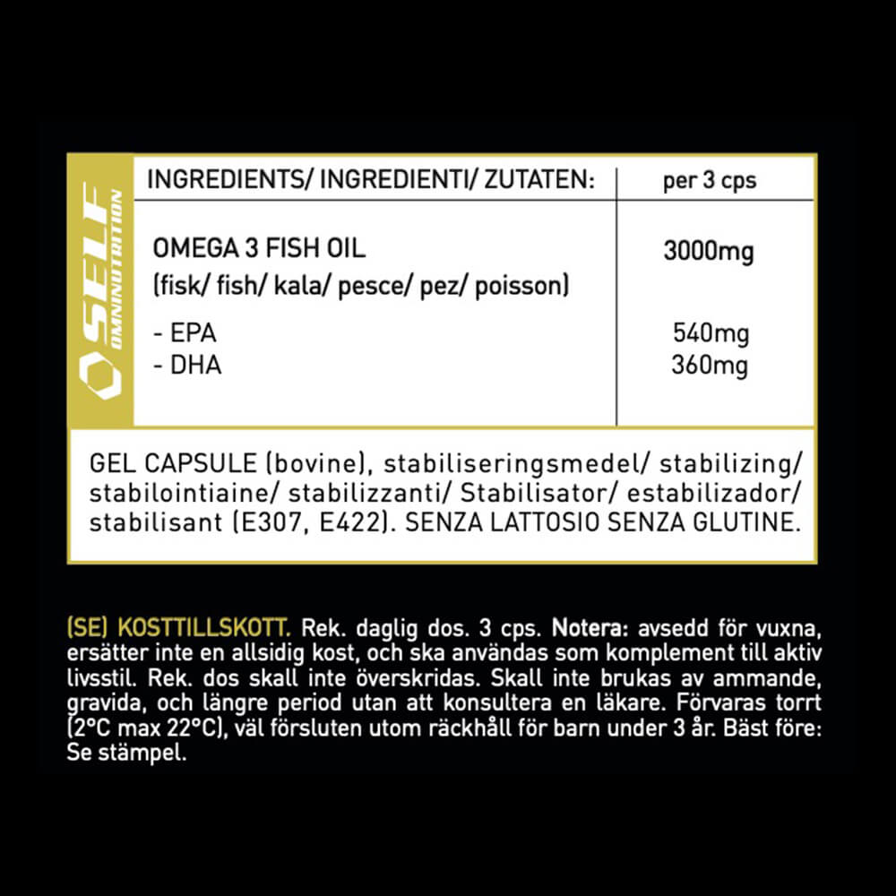 Innehåll / Ingredienser: Omega-3 (EPA & DHA-fettsyror), antixodationsmedel (E307), kapsel (gelatin). Dosering: 3 kapslar per dag Förvaring: Bör förvaras väl förslutet, torrt och oåtkomligt för barn. Ursprungsland: Sverige Förpackning: 60 kapslar á 1000 mg