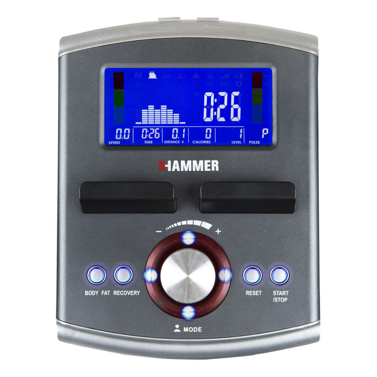 Färg: antracit/svart Dimensioner:   Längd: 163 cm Bredd: 53 cm Höjd: 164 cm Display:   Typ: Blå bakgrundsbelyst 5.8 tums LCD-skärm Visar: Tid, hastighet, distans, kaloriförbrukning, puls, varv per minut, watt, motstånd Program: 22 st program (inklusive 4 st HRC-program och 4 st användarprofiler) Tekniska detaljer:   Ergometer: Ja, 10W - 350W Handpuls: Ja Motstånd: Elektromagnetiskt Motståndsnivåer: 16 st Trådlös pulsmottagning: Ja, finns som tillbehör (5 kHz) Svänghjul vikt: 12 kg Drivsystem: Remdrift Steglängd: 43 cm Strömförsörjning: 230 V, 50 Hz Pedaler/Fotplatta: Avstånd 14 cm Transporthjul: Ja Medföljer: Manual Vikt: 55 kg Max användarvikt: 130 kg Montering behövs: Ja Rekommenderad minimumhöjd till tak: 30 cm + din längd. Manual: Engelska, tyska, franska Övrigt: Hållare för bok eller surfplatta