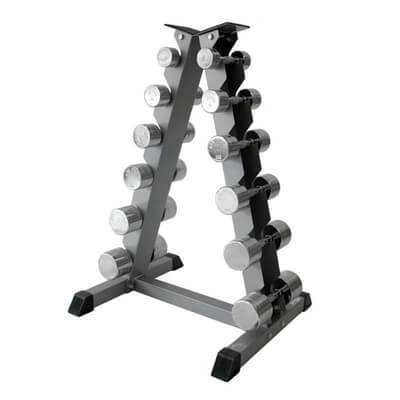 6 par (12 st.) kromade hantlar och hantelställ för 6 par hantlar.