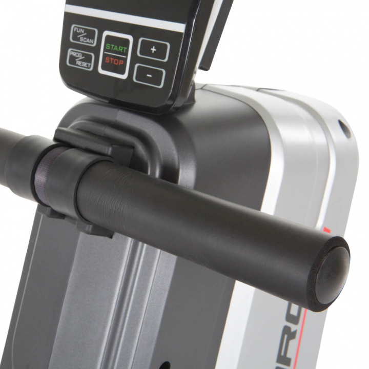 Färg: silver/svart Dimensioner:   Längd: 157 (hopfälld 66) cm Bredd: 55 (hopfälld 55) cm Höjd: 78 (hopfälld 157) cm Display:   Typ: Blå bakgrundsbelyst LCD-skärm Visar: Tid, distans, kaloriförbrukning, puls, watt. Program: 14 st förkonfigurerade träningsprogram, 4 st användarprofiler, 1 st pulsbaserat program, 1 st Race-program. Tekniska detaljer:   Motstånd: Permanent magnet Motståndsnivåer: 16 st Trådlös pulsmottagning: Ja, finns som tillbehör (Bluetooth) Drivsystem: Remdrift Strömförsörjning: 230 V, 50 Hz Hopfällbar: Ja Pedaler/Fotplatta: Avstånd 18 cm Transporthjul: Ja Vikt: 24 kg Max användarvikt: 110 kg Montering behövs: Ja - Mer info